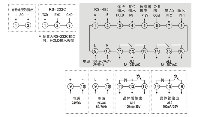 光電隔離通訊接口RS-485/RS-232C,波特率范圍2400~38400bps,Modbus RTU通訊協議